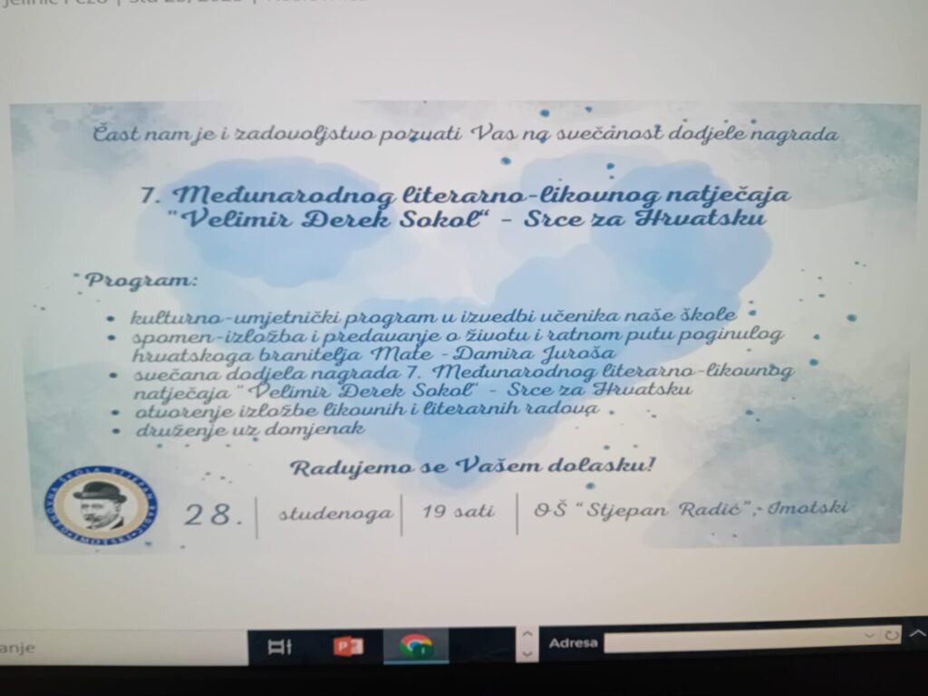 Na 7. Međunarodnom literarno- likovnom natječaju “Velimir Đerek Sokol” – Srce za Hrvatsku likovni rad našeg Josipa Zečića, učenika 8.r. osvojio je treće mjesto.